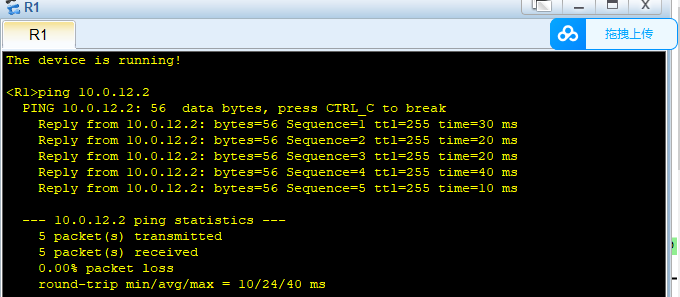 routing-table 命令查看路由表,可以观察到各路由器的路由表都存在相关 OSPF 路由条目。在 R1 上使用 ping