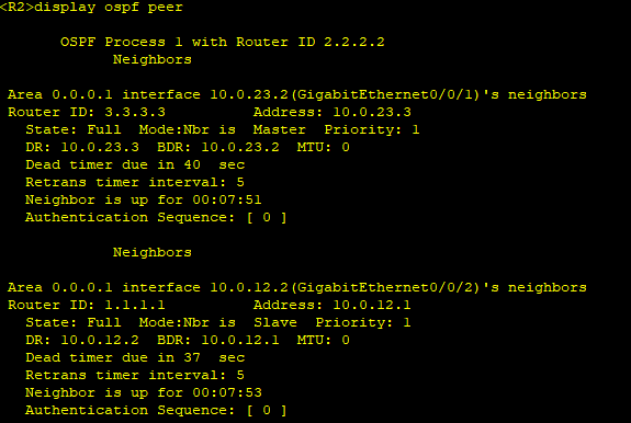以 R2 为例,使用 display ospf peer 命令查看 OSPF 邻居的详细信息,或者使用 display ospf